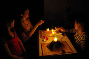 Для этого гадания потребуется таз с водой, по краям которого крепятся полоски бумаги, на которых написаны различные события или желания: свадьба, помолвка, знакомство с будущим супругом и т.д. Когда вы всё подготовили, нужно взять половинку скорлупы грецкого ореха и закрепить в ней огарок церковной свечи. Чтобы свеча не нарушала равновесия, мы просто переплавляли немного обычной свечи в скорлупу и вставляли туда фитилёк. Этот «кораблик» следует аккуратно поставить в середину таза, зажечь свечу и немного раскрутить воду по часовой стрелке. Скорлупа должна сама подплыть к одной из записок. Желание исполнится только в случае, если бумага при контакте с «корабликом» загорится от пламени свечи.