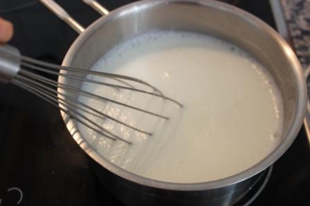 - Затем вливаем, постоянно помешивая венчиком, раствор молока с крахмалом.
